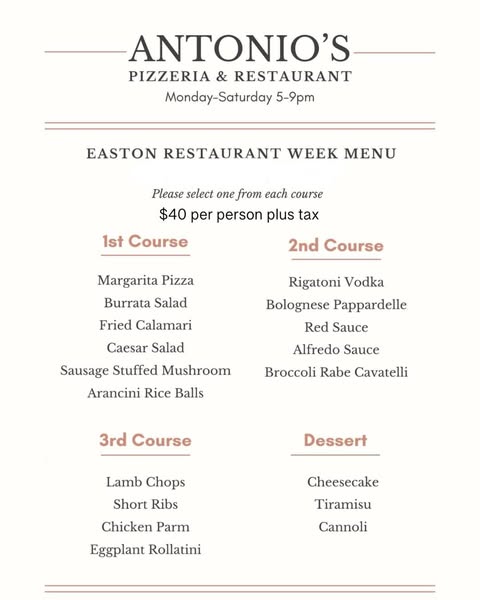 Don't miss out on these exclusive prix-fixe menus! Be sure to tag us in all of your #EastonFoodie posts for a chance to win our grand gift card giveaway! 🍽