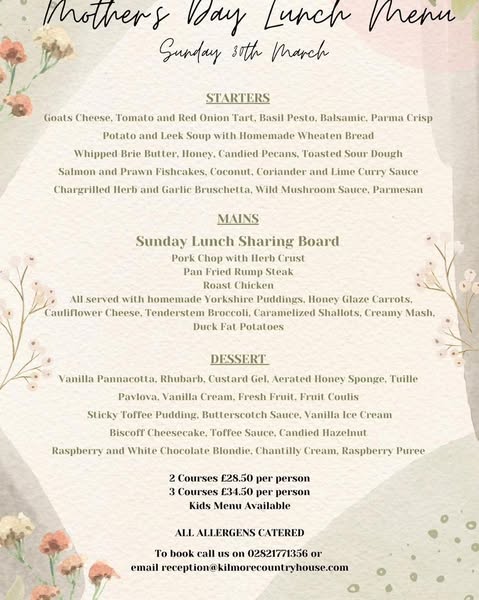 For enquiries or to book a table please call 02821771356 or email reception@kilmorecountryhouse.com