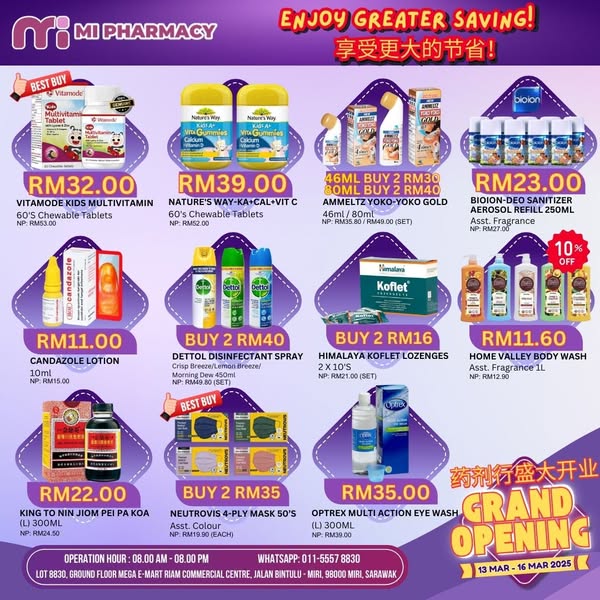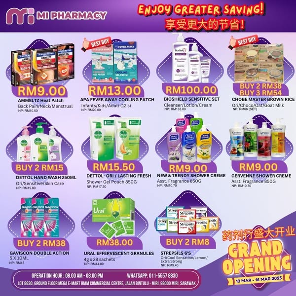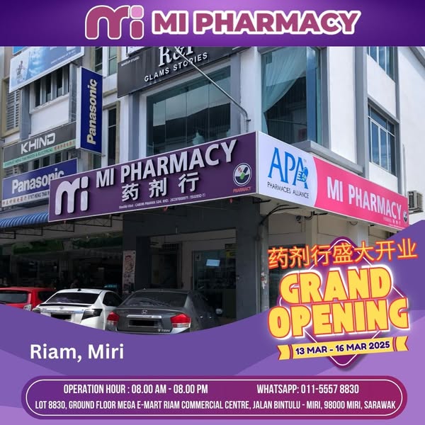 搜索关键词 Mi Pharmacy Riam, Grand Opening Event, Free Health Checks, Health and Wellness, Pharmacy Discounts, Riam Pharmacy, Blood Test, Free Food Sampling, Lion Dance Show, Pharmacy Promotion优势 Free health checks,Free food and drink sampling,Crazy discounts,Lion Dance show,Free Ice Cream