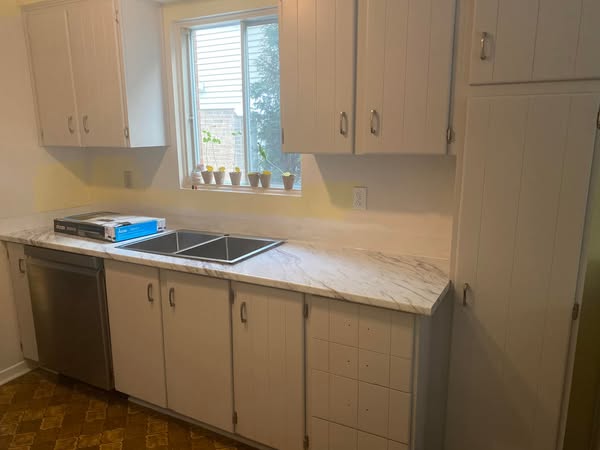 This kitchen was in need of some revitalization, and it's now been beautifully restored. The clients invested in a new countertop and are taking on the painting themselves, proving that with some determination, anyone can breathe new life into their space, even on a budget.
