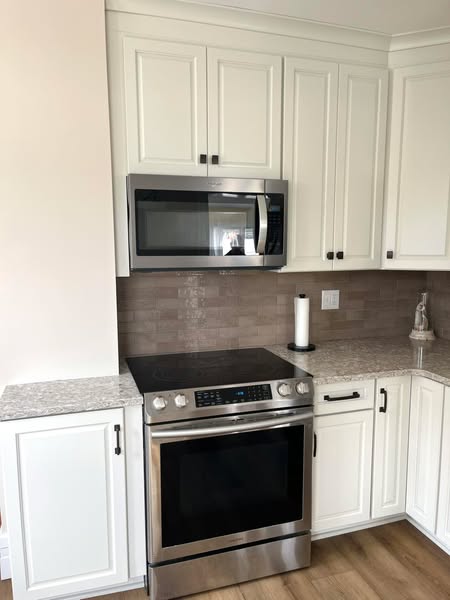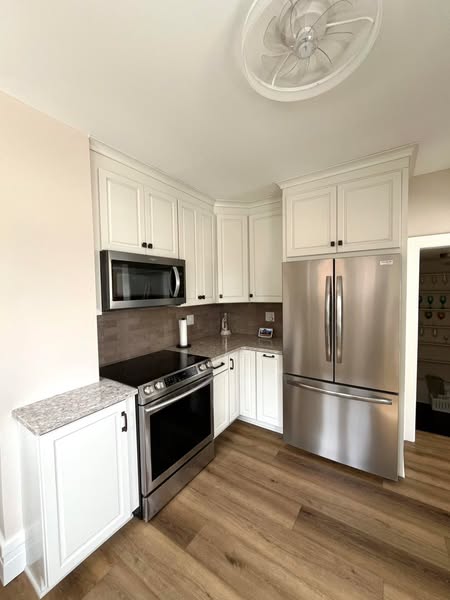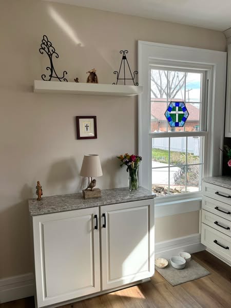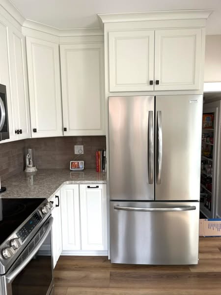 The kitchen was long overdue for an update! To maximize both functionality and storage, the decision was made to close off an unused doorway, effectively expanding the available wall space. This move increased the amount of cabinetry and countertop space. Additionally, we relocated the refrigerator to a more convenient spot, shifting it away from the traffic zone and positioning it closer to the cooking and prep areas. This not only streamlined the flow of the space, but also made the kitchen feel much more open. The changes were all about creating a more efficient layout while giving the kitchen a fresh, modern feel.