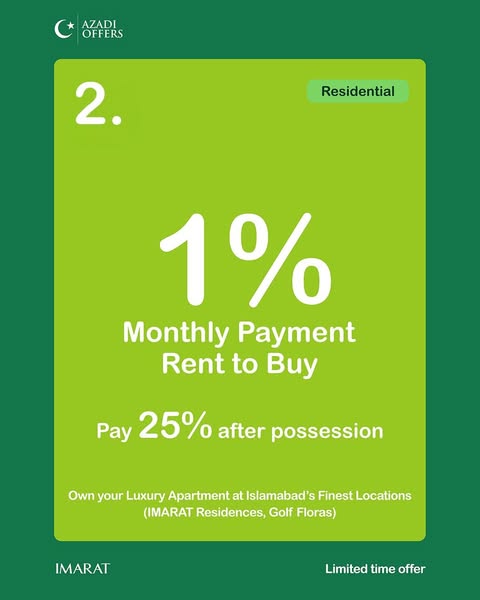 搜索关键词 real estate, 0% down payment, property investment, rent to buy, home ownership, Azadi Offer, Graana.com, Pakistan property, affordable housing, Imarat优势 0% Down Payment,1% Monthly Rent-to-Buy,10% Down Payment Options,Removes traditional barriers to ownership