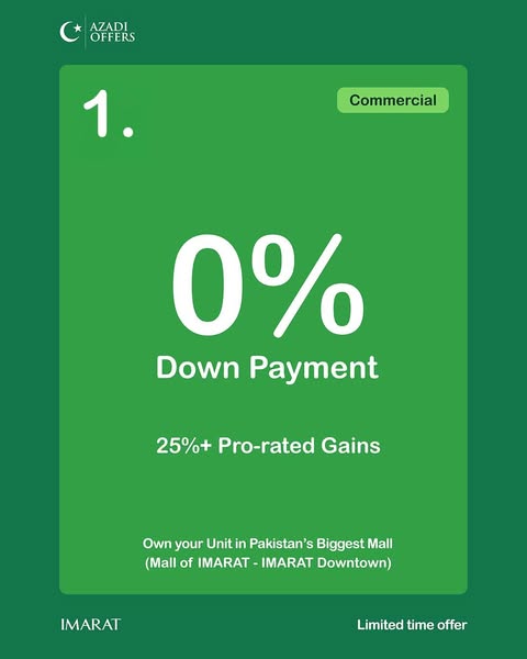 搜索关键词 own property, 0% down payment, rent to buy, real estate investment, Azadi Offer, property ownership, first time home buyer, Pakistan real estate, Graana.com, IMARAT properties优势 0% Down Payment Options,1% Monthly Rent-to-Buy Option,10% Down Payment on Apartments,Removes Traditional Barriers to Ownership