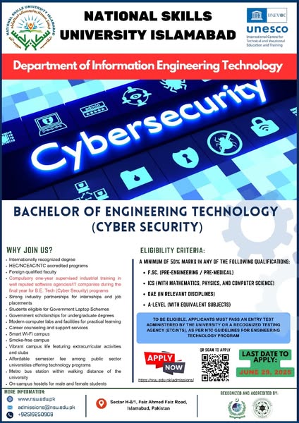 National Skills University, Islamabad invites you to apply for our undergraduate programs for Fall 2025. Don’t miss the chance to be part of a leading institution focused on skill-based education and excellence.