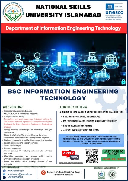 搜索关键词 National Skills University, Undergraduate Programs, Admissions Fall 2025, Skill-based education Islamabad, NSU Islamabad, Apply for University, Higher Education Pakistan, Future Education Skills, Islamabad University Admissions, Pakistan University Programs优势 Skill-based education,Leading institution,Opportunity to shape your future