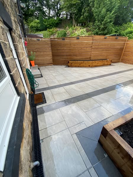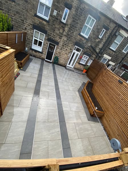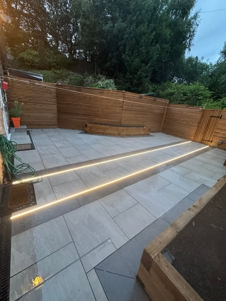 搜索关键词 garden transformation, landscaping services, garden design, outdoor lighting, porcelain paving, springhead oldham, home improvement, dream garden, custom planters, venetian fencing优势 High-quality materials (Kandla Grey Porcelain),Customizable design (planters, fencing),Ambient lighting for evening enjoyment,Practical solutions (bin storage)
