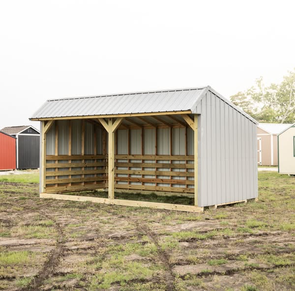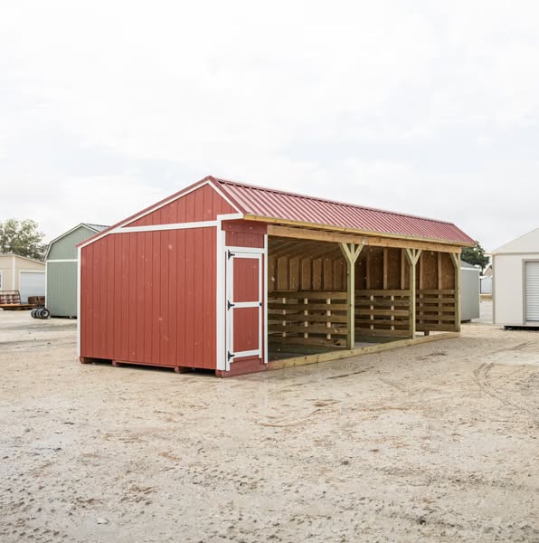 This 12x24 animal shelter is a standard, open-design structure with durable metal siding. Featuring a striking rustic red and black color combination, it provides ample space and protection for livestock. With no gates or stall dividers, it offers a flexible layout for various animal care needs while maintaining a simple and functional design. Price As Shown: $6,185 60 Month RTO Payment: $245