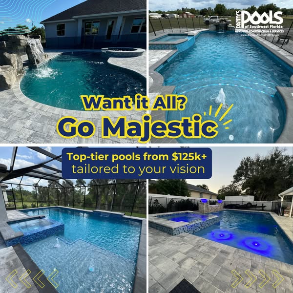 WANT IT ALL? GO MAJESTIC with Danny's Pools! Our top-tier packages ($125K+) deliver resort-quality luxury tailored to your exact vision. Dramatic rock waterfalls, sophisticated lighting, premium finishes, and show-stopping water features that turn heads. From permit to paradise in just 4-6 weeks! Your dream backyard is just one call away: 941-565-8861.