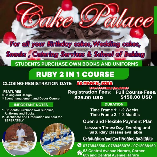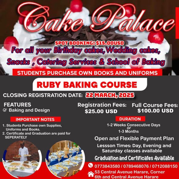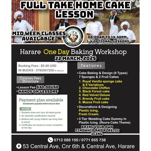 搜索关键词 Baking courses, Harare baking, Central Avenue, Baking lessons, Zimbabwe courses, Book baking, advance booking, baking training, baking skills, culinary courses优势 Various Courses,Central Location,Advance Booking