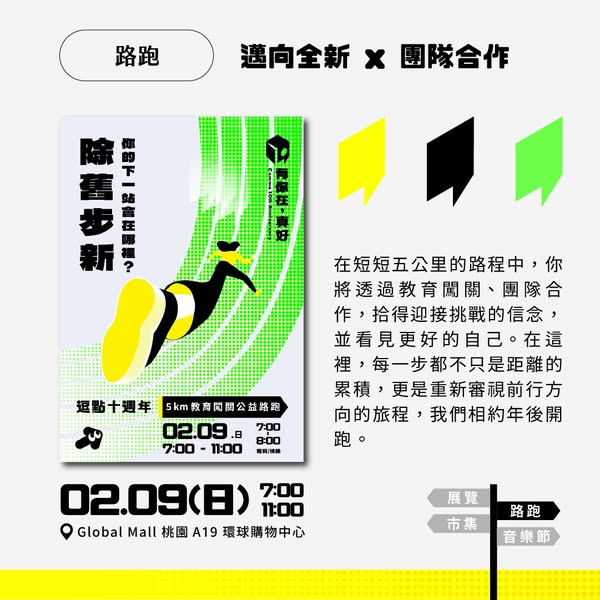 在短短五公里的路程中,你將透過教育闖關、團隊合作,拾得迎接挑戰的信念,並看見更好的自己。在這裡,每一步都不只是距離的累積,更是重新審視前行方向的旅程,我們相約年後開跑。