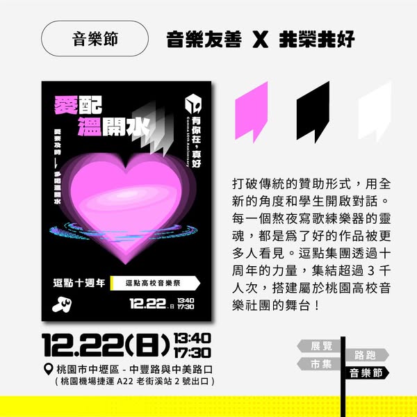打破傳統的贊助形式,用全新的角度和學生開啟對話。每一個熬夜寫歌練樂器的靈魂,都是為了好的作品被更多人看見。逗點集團透過十周年的力量,集結超過3千人次,搭建屬於桃園高校音樂社團的舞台!