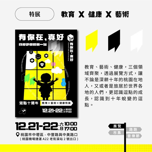 教育、藝術、健康,三個領域齊聚,透過展覽方式,讓不論是深耕十年的桃園在地人,又或者是旅居於世界各地的人們,更認識逗點的成長,認識到十年蛻變的逗點。