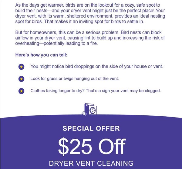 Warmer days might bring birds into your dryer vent! Great for birds - but not so great for you. Nests can block airflow in your vent, causing lint buildup, increasing the risk of overheating and even potential fire.