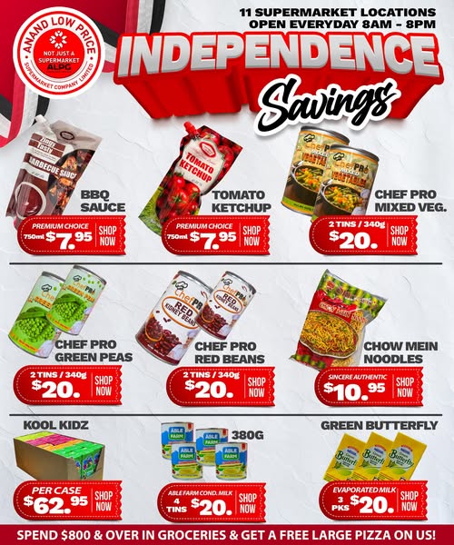 搜索关键词 Independence savings, Low price supermarket, Groceries deal, Free pizza, Trinidad and Tobago, Discount grocery, Fresh meats, Ice cold drinks, Anand Low Price, Supermarket promotion优势 Low Prices,Bonus Pizza with Purchase,Convenient Shopping Hours,Wide selection of products