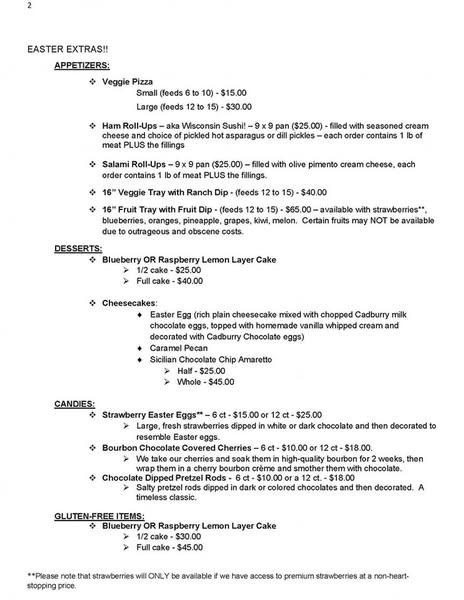 Wow your guests with our adorable Easter Egg Strawberries. Stun your in- laws with our amazing cheesecakes! Take time to enjoy your holiday by letting us prepare your meal! So many options!!
