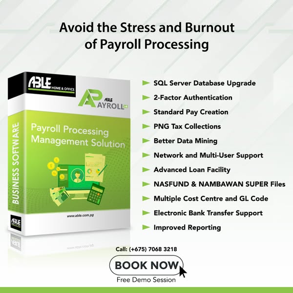 Able Payroll v8 is a powerful and reliable payroll management system designed specifically for businesses in Papua New Guinea. It automates payroll processing, generates accurate payslips, and ensures full compliance with local requirements such as SSP, SOR, tax, and superannuation. With features like multi-user access, leave and deduction tracking, and integration with biometric attendance systems, Able Payroll v8 helps streamline HR operations and simplifies government reporting—all with dependable local support.