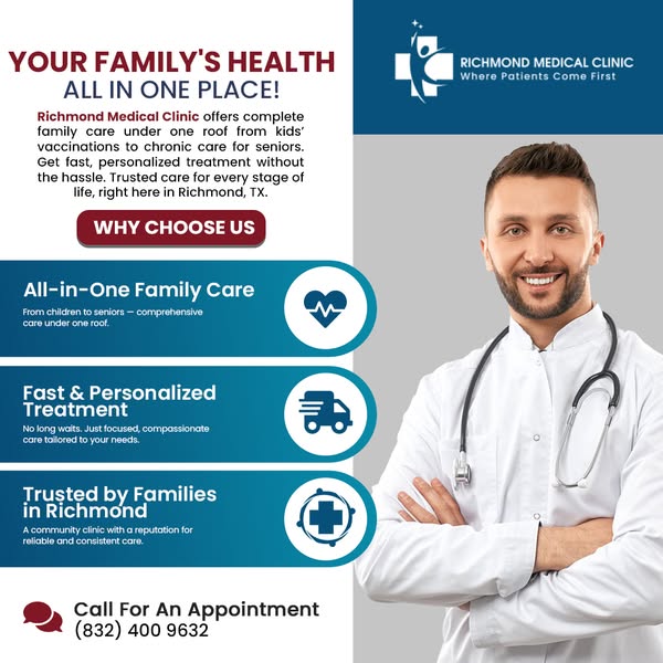 From kids to seniors, Richmond Medical Clinic provides complete, personalized care with no long waits. Experience compassionate family healthcare in Richmond, TX — trusted by local families for consistency and reliability.