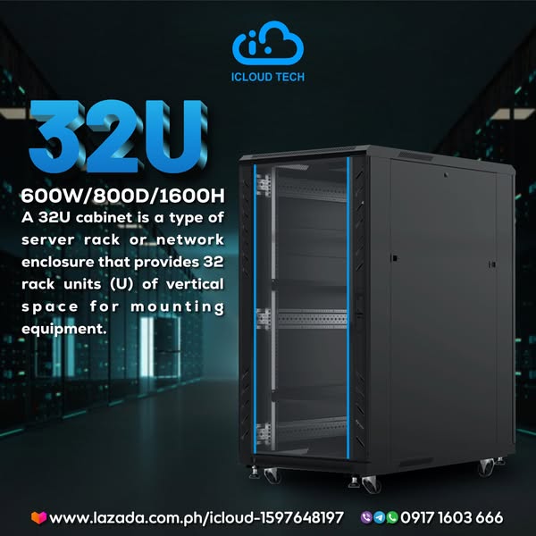 A 32U cabinet is a type of server rack or network enclosure that provides 32 rack units (U) of vertical space for mounting equipment.