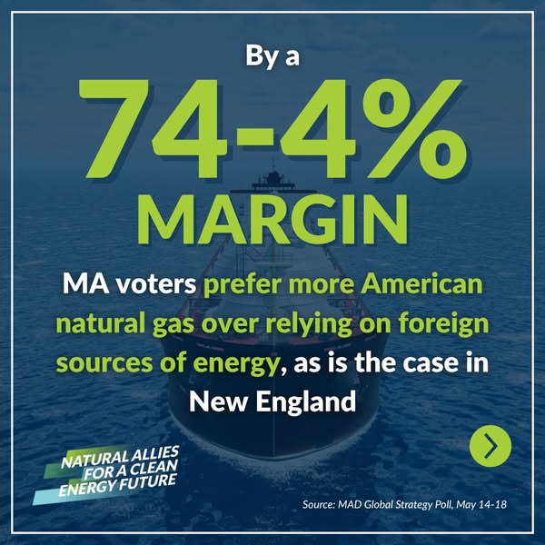 Additionally, after years of anti-natural gas policies, resulting in higher costs, higher carbon emissions, and greater risk to our energy security, nearly 3 in 4 Massachusetts voters prefer more American natural gas over relying on foreign sources of energy, as is the case in New England.