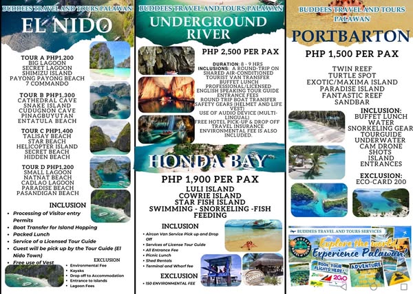 搜索关键词 Palawan tours, El Nido tours, Affordable travel, Island hopping, Puerto Princesa tours, budget travel, Philippines travel, domestic flights, international flights, trusted travel agency优势 Affordable rates,Wide range of destinations in Palawan,Booking for land, air, and sea travel,Catering to solo travelers, couples, groups,100% Legit and trusted agency
