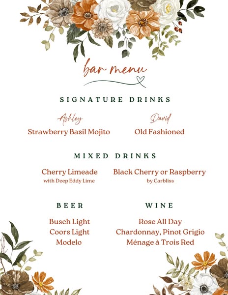 Let's talk menus. Our bar events are deliberately designed to coordinate with your theme, and we design signage and use florals and decor to complement and enhance your vibe. These are a few of the unique drinks and menus we designed for customers in 2024. What do you have going on in 2025? We'd love to help make your event memorable with cocktails, mocktails or one of our grazing options. Licensed and insured in Kansas. We serve Johnson Co. and surrounding area!