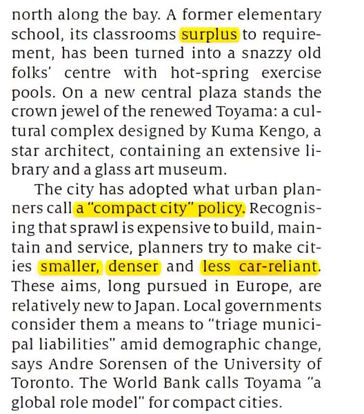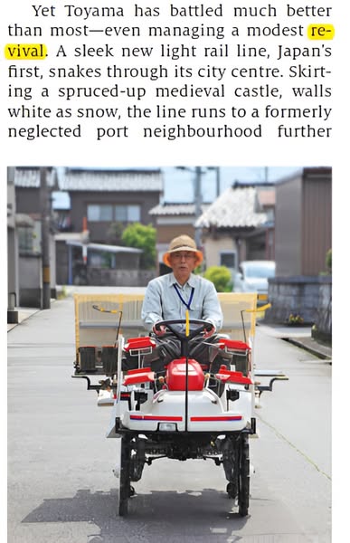 Toyama (250 km về phía tây bắc Tokyo) là một thành phố Nhật Bản kiểu mẫu (quintessential): dân số đang già đi (residents are greying), các ngành công nghiệp ổn định nhưng cứng nhắc và khó thay đổi (industry is stable but sclerotic), và ẩm thực thì thượng hạng (cuisine is exquisite). Từ những năm 1990s, thành phố này phải đối mặt với những nguy cơ (ills) từ nền dân số già hóa: tiền trợ cấp tăng mạnh (ballooning bills), thuế giảm (falling tax revenues) và thiết kế đô thị lỗi thời (out-of-date urban plan)