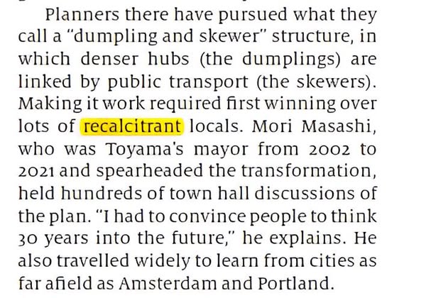 💪💪Để giải quyết những vấn đề trên, Toyama đã thực hiện chính sách “thành phố nhỏ gọn” (to have adopted a “compact city” policy): vì phát triển theo chiều ngang (sprawl) sẽ đắt đỏ để xây, duy trì và cung cấp dịch vụ, những nhà thiết kế đô thị muốn biến Toyama thành một thành phố này nhỏ hơn, đông đúc hơn (denser) và ít phụ thuộc vào ô tô hơn (less car-reliant). Cụ thể, thành phố này sẽ được tái cấu trúc theo kiểu ‘miếng há cảo và cái que xiên’ (‘dumpling and skewer’): những khu trung tâm đông đúc hơn (denser hubs) (những miếng há cảo) được kết nối bởi giao thông công cộng (public transport) (que xiên). Lãnh đạo thành phố cũng mất rất nhiều công sức để thuyết phục những người dân bản địa cứng đầu (recalcitrant locals)