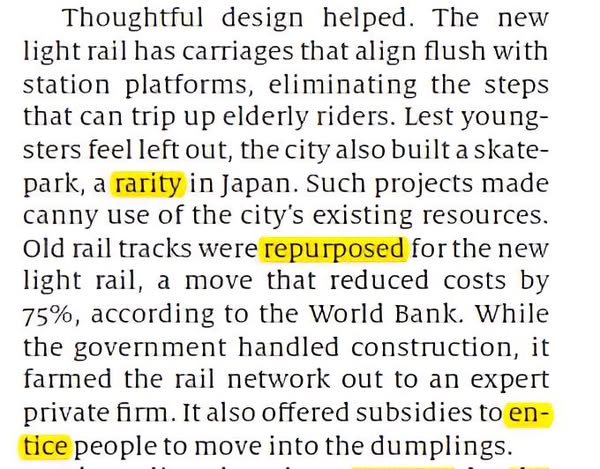 Những đường ray cũ được ‘tái mục đích’ (to be repurposed, tức sử dụng với mục đích khác mục đích ban đầu) cho hệ thống tàu điện mới, giúp tiết kiệm chi phí rất nhiều. Chính quyền ngoài giao việc xây dựng cho công ty tư nhân có chuyên môn (an expert private firm) còn tặng tiền để hấp dẫn người dân chuyển đến những vùng ‘há cảo’ (to offer subsidies to entice people to move into the dumplings)