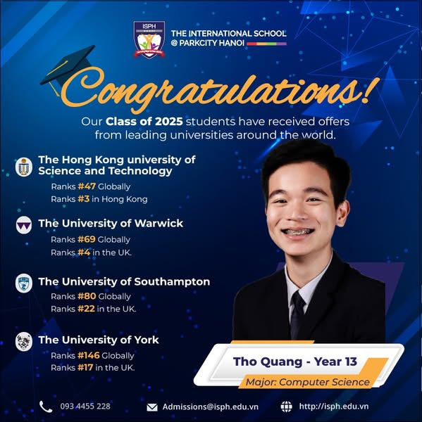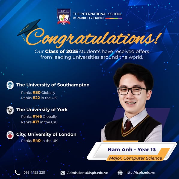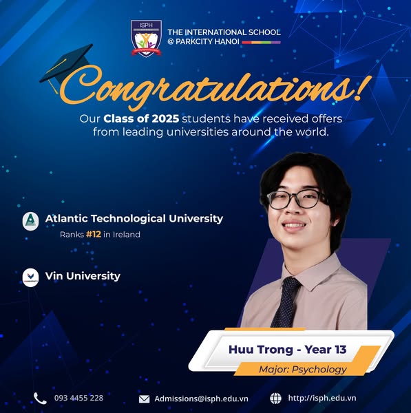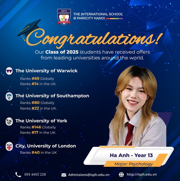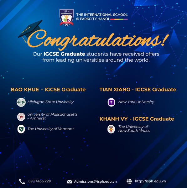 搜索关键词 International School Hanoi, University Acceptance, IGCSE A Level, ISPH Hanoi, International Education, ParkCity Hanoi, Top International School, University Placement Results, Global Education, Private School Hanoi优势 Successful university placement,Strong academic foundation (IGCSE & A Level),Prestige locations, US, UK, Australia