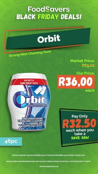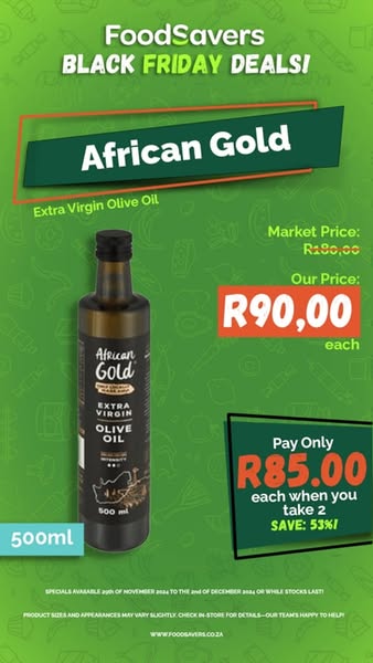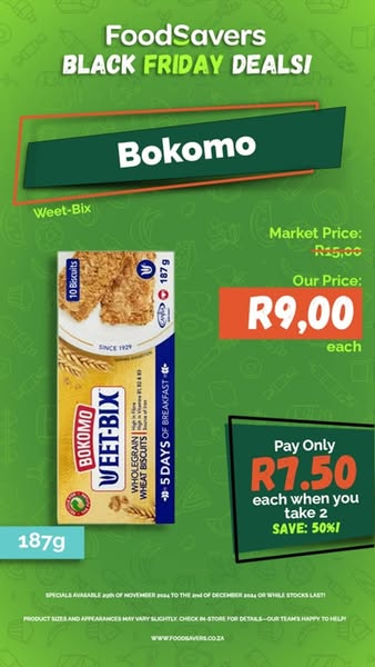 搜索关键词 Black Friday Deals, Grocery Specials, FoodSavers Pretoria, Discount Groceries, November Savings, December Savings, Kolonnade Shopping Centre, Limited Time Offer, Food and Beverage Sale, Stock Up Savings优势 Significant discounts (averaging 53% off),Variety of products on sale,Limited-time offer (Black Friday)