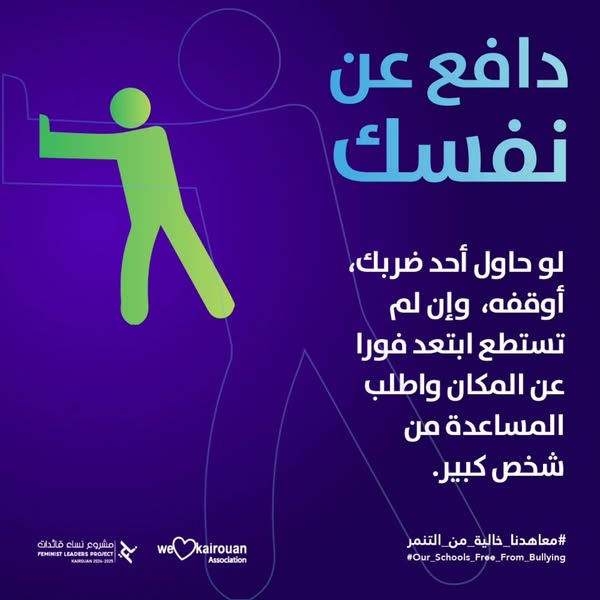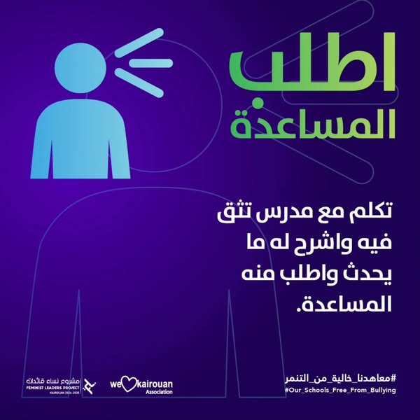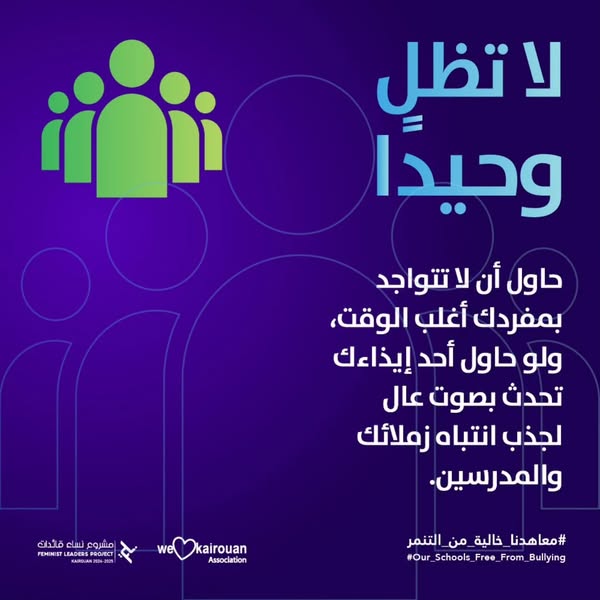 في إطار مشروع " نساء قائدات " ومبادرة الصحة النفسية، تأتي هذه الحملة التوعوية ضد التنمر في المعاهد الثناوية و الإعدادية بالقيروان ، نتيجة لعمل جماعي وتشاركي.