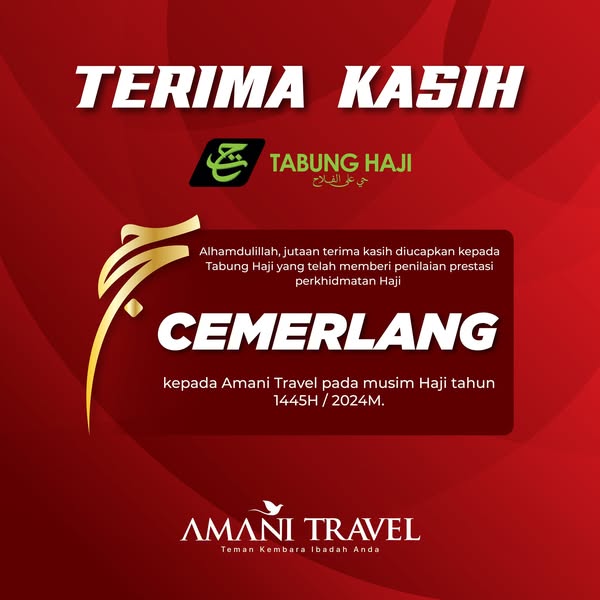 Pihak Tabung Haji juga telah memberi pemarkahan Penilaian Pretasi Perkhidmatan Haji yang 𝐂𝐄𝐌𝐄𝐑𝐋𝐀𝐍𝐆 kepada syarikat Amani Travel pada musim haji 1445H/2024M.