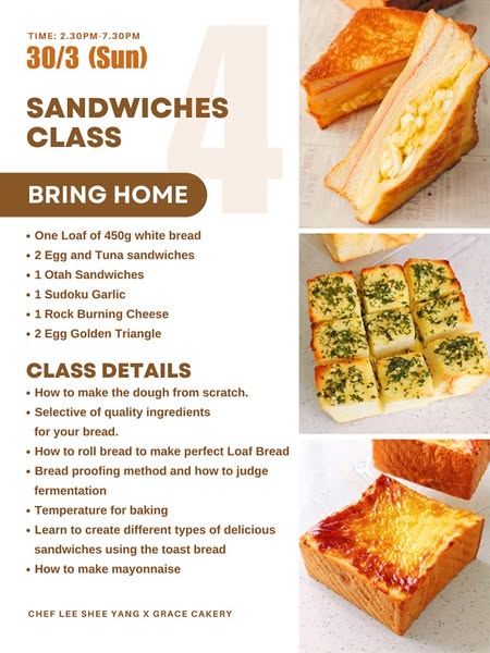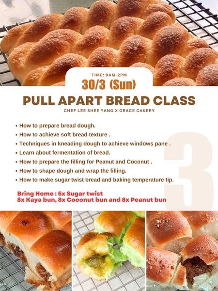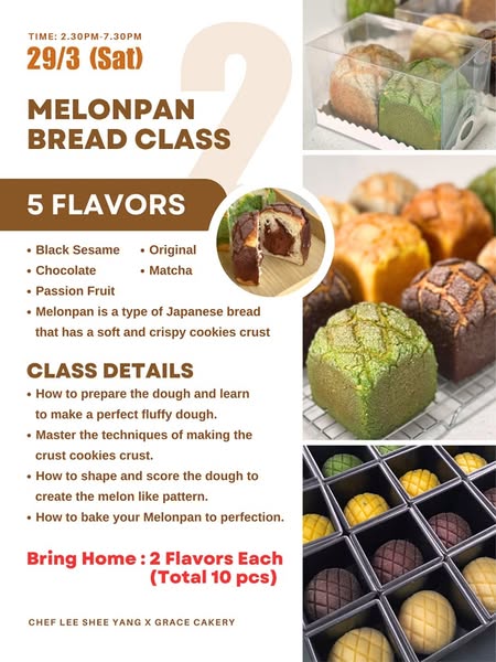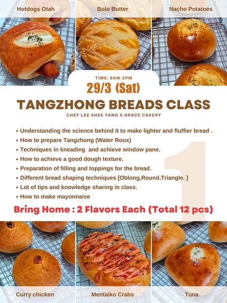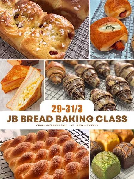 搜索关键词 JB bread baking, bread baking class, TangZhong bread, Melonpan class, pull apart bread, sandwiches class, Shio Pan, Wassant Milk Bread, baking techniques, bread recipes优势 Variety of bread types,Hands-on experience,Detailed class details,Multiple dates and times