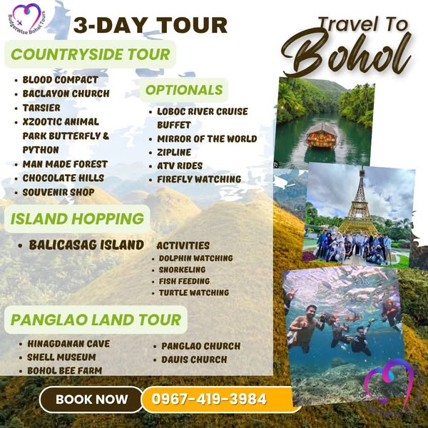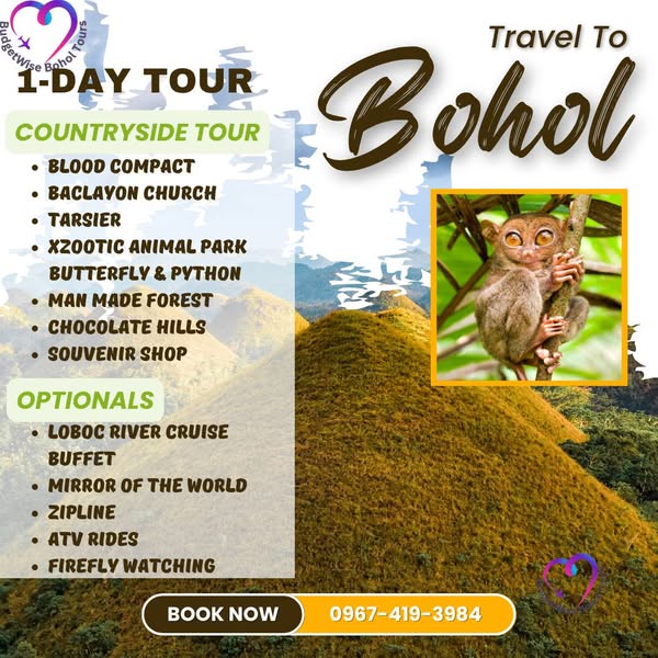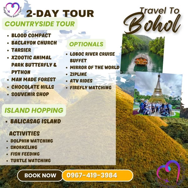 搜索关键词 Bohol tours, affordable travel, Philippines travel, island adventure, budget travel, local guides, countryside escape, travel packages, Bohol vacation, Bohol island tour优势 Affordable prices,Trusted by many travelers,Local guides,Comfortable rides,Flexible tour options (1-3 days)