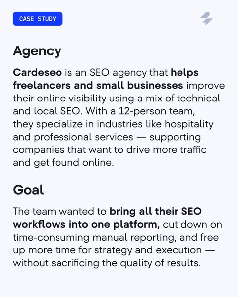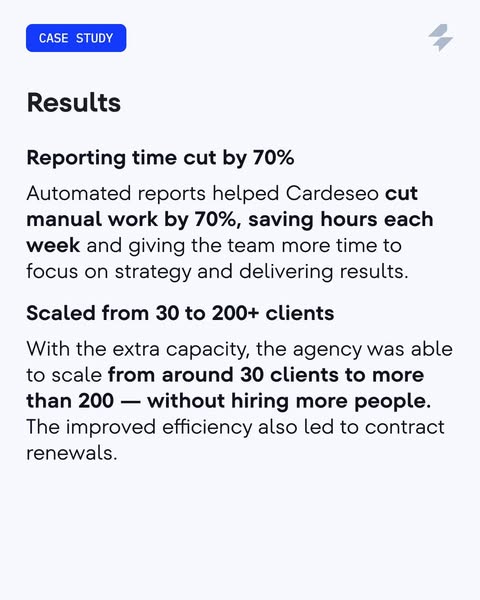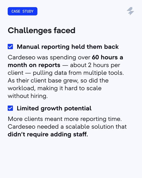 Manual SEO reporting = growth bottleneck. That was Cardeseo’s reality—2 hours per client report, over 60 hours a month just pulling data.