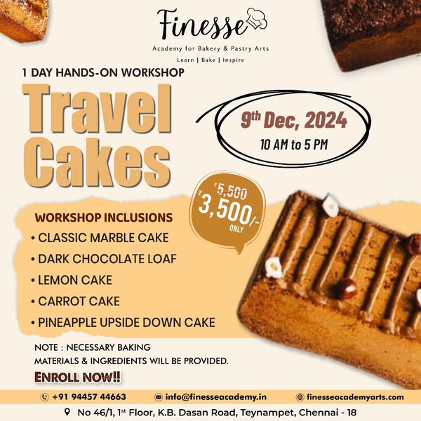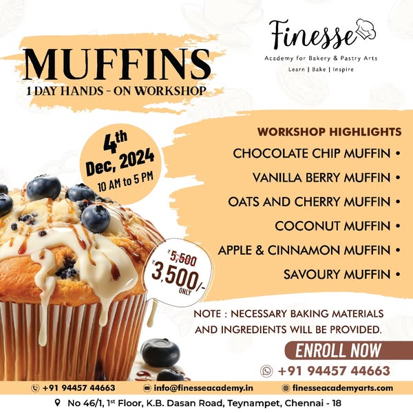 搜索关键词 baking workshop Chennai, pastry arts training, December baking course, finesse academy, career in baking, baking skills, chennai culinary school, become a baker, pastry chef course, baking academy near me优势 Learn baking skills,Career growth potential,Festive season focus