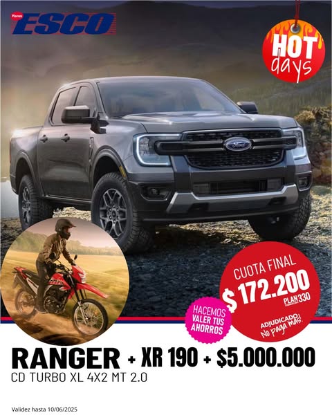 #EscoLomas #TuProximo0km #PromoEsco #PlanesDeAhorro #DescuentosEspeciales #EscoTeAcompaña #HotSale #diasdedescuento #Honda #tornado #xr300 #XR190L #fiat #cronos #cronosdrive #ford #Ranger