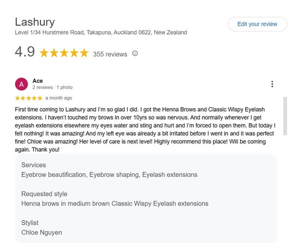 At Lashury, we take the time to customize the length and curl to suit your unique style and face, ensuring your lashes are just right for you. You’ll relax in our cozy Takapuna salon with soothing music – it’s a beauty treatment that doubles as a little moment of calm! We’re proud to have a 4.9-star rating on Google with over 350 reviews, and our clients adore their new lash look. 😊