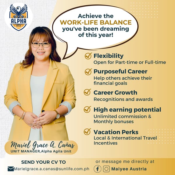 搜索关键词 Sun Life Philippines, Financial Advisor, Work from home, Income opportunity, Career opportunity, Financial services, Flexible schedule, Insurance sales, Recruitment优势 Work-from-home flexibility,Flexible Schedule,Unlimited income opportunities,Travel incentives,Professional growth