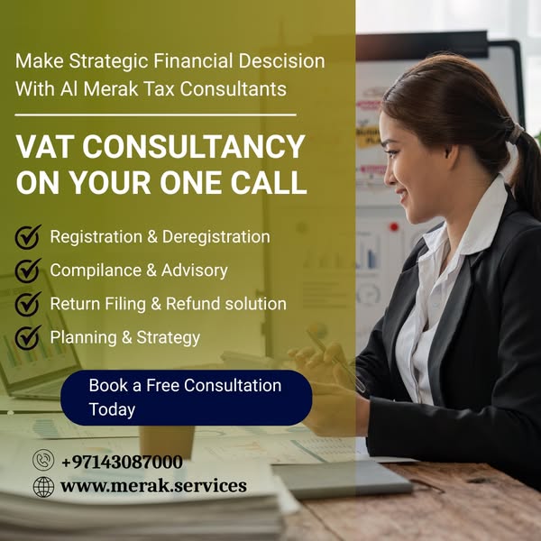 搜索关键词 UAE tax laws, corporate tax planning, VAT registration, audit support, tax compliance, reduce tax liabilities, business tax, tax consultant, strategic solutions, Merak Services优势 Expert tax consultation,Tailored to business needs,Accurate and timely solutions,Reduces tax liabilities,Avoids penalties,Ensures compliance