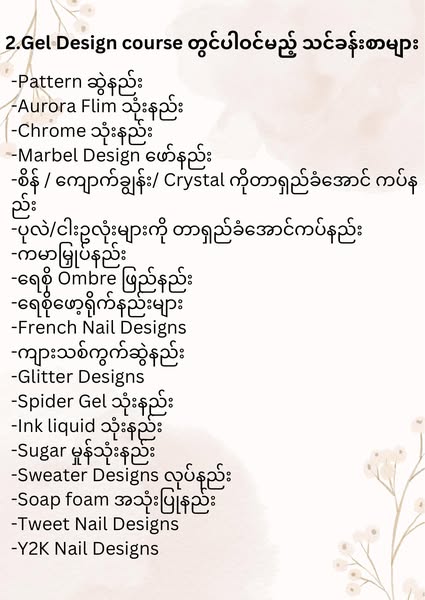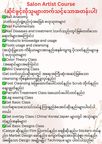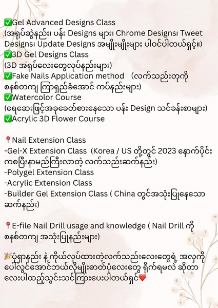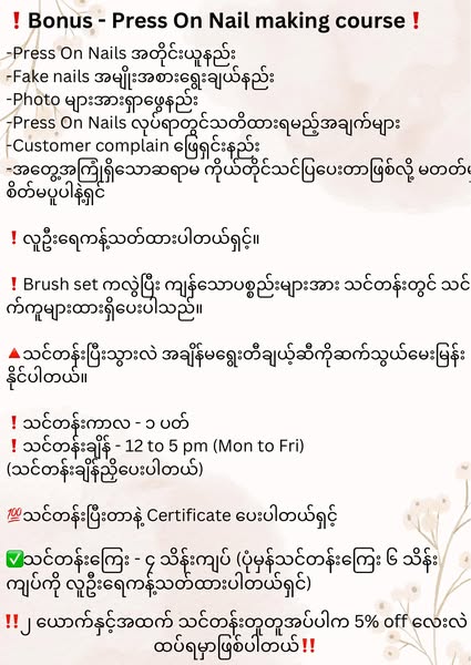搜索关键词 nail art training, nail art course, vocational training, Myanmar training, beauty course, nail technician course, Rangon course, job security course, 5% discount, limited seats优势 Taught by experienced instructor,Small class size,Promotion pricing available,5% discount for enrolling in pairs,Job security promise