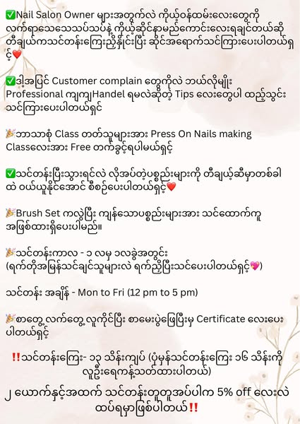 📍Rica's Nail Training Studio ရဲ့ Tr.Ei ကိုယ်တိုင် အနီးကပ်လူနည်းစုနဲ့သင်ပေးမဲ့ လက်သည်းသင်တန်းကြီးကို Join လိုက်တာနဲ့ ဘဝအာမခံချက်ရှိတဲ့ လက်သည်းပညာရပ်တစ်ခုရစေရမယ်လို့ အာမခံပါတယ်ရှင်။