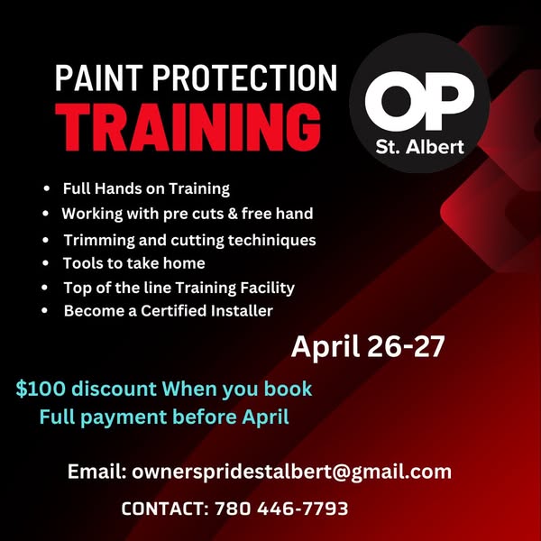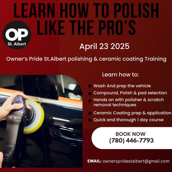 Join us this April/May at **Owner's Pride St. Albert** for hands-on, professional training courses designed to boost your skills and help you stand out in the detailing industry. We’re here to help you master your craft.