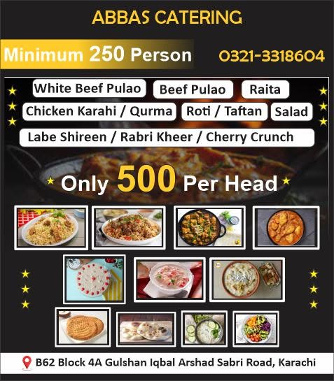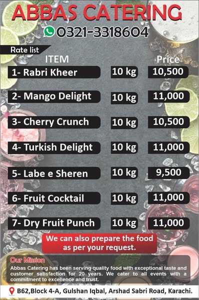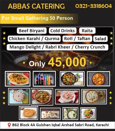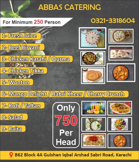 搜索关键词 pakistani food catering, karachi catering service, biryani qourma, traditional pakistani, wedding catering, party catering, family dinner, abbas catering, mango delight, turkish delight优势 Authentic Pakistani Flavors,Catering for various events,Wide variety of dishes