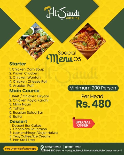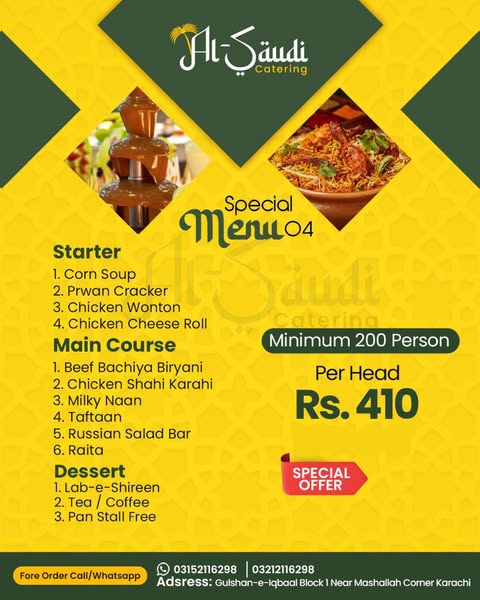 搜索关键词 Pakistani cuisine catering, Karachi catering, wedding catering, event catering, Al Saudi catering, best catering service, authentic Pakistani food, catering for events, delicious dishes, fresh ingredients优势 Authentic Pakistani cuisine,Fresh ingredients,Wide variety of dishes,Best catering services in Karachi