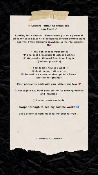 搜索关键词 custom portrait art, personalized gift philippines, handcrafted portrait commission, charcoal portrait drawing, watercolor portrait painting, art commissions open, support local artist, portrait from photo, minimal frame portrait, unique gift idea优势 Handcrafted and personalized,Variety of styles and media,Framing option available,Free shipping within the Philippines