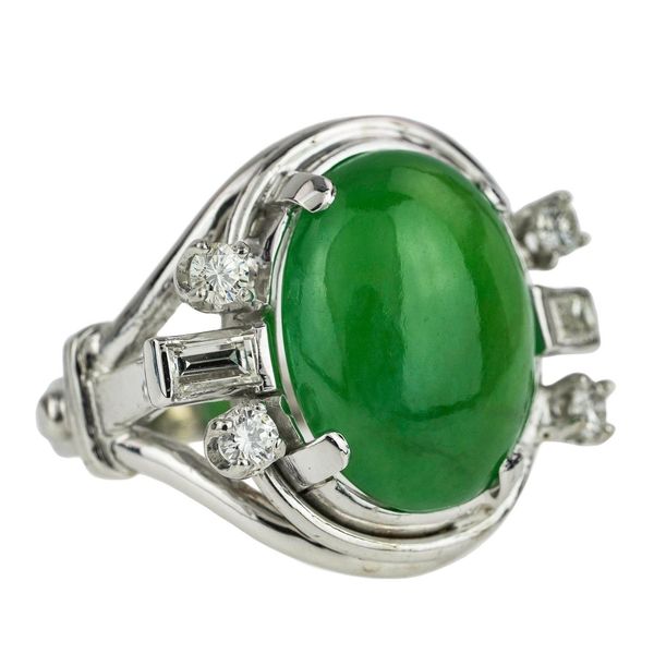 Lot 99: Modern 14k white gold jade ring with diamonds—natural jade center (15x12mm), accented by round and baguette diamonds (Size 6)
