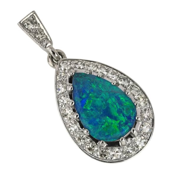Lot 97: 14k white gold teardrop opal pendant (12x8mm) surrounded by 22 sparkling diamonds