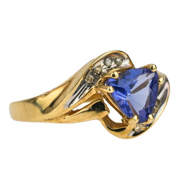 Lot 98: 10k yellow gold ring with diamonds and a striking triangular-cut blue center (Size 7)