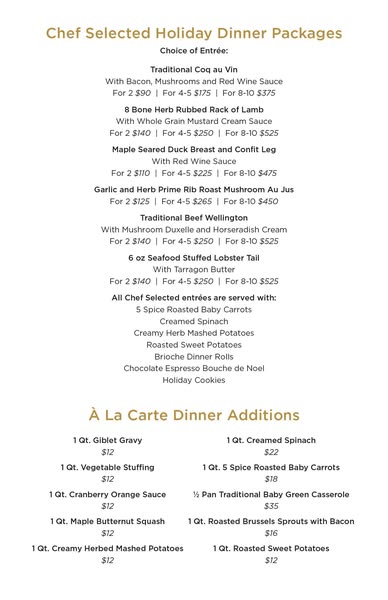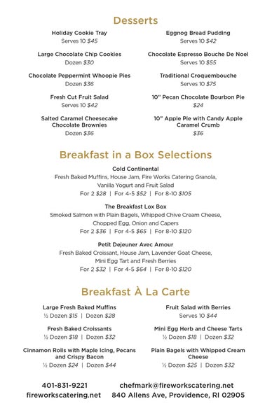 Appetizers, charcuterie, dinner packages, sides, and dessert for Christmas and New Year’s Eve, and breakfast for Christmas and New Year’s mornings.